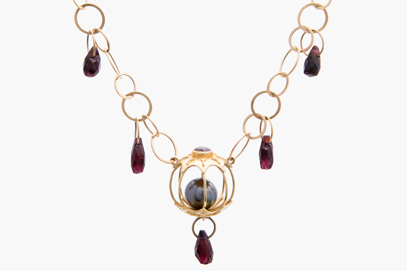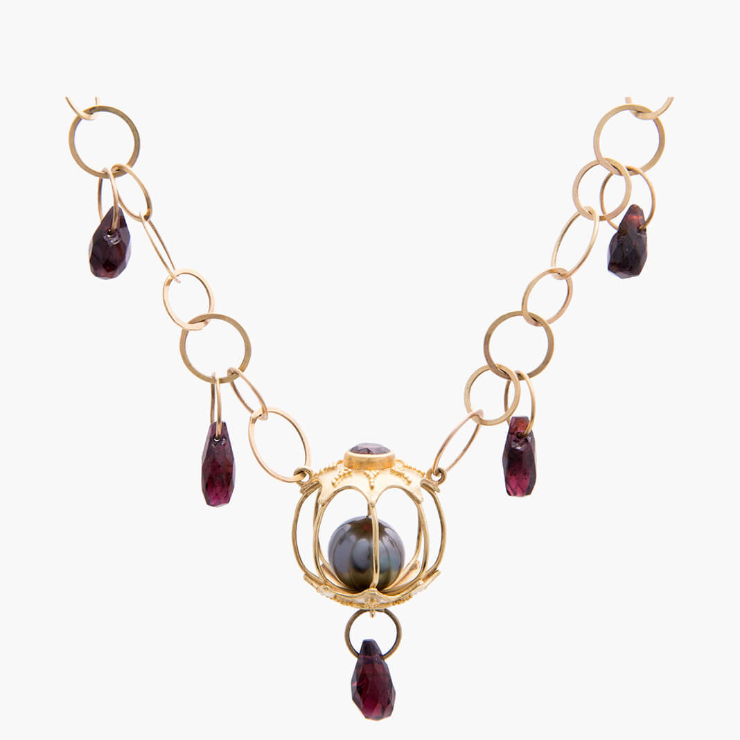 Kette „prisionero de su obsesión”, Gold 750, 900, Granate, Tahitiperle k_ea_03 (verkauft)