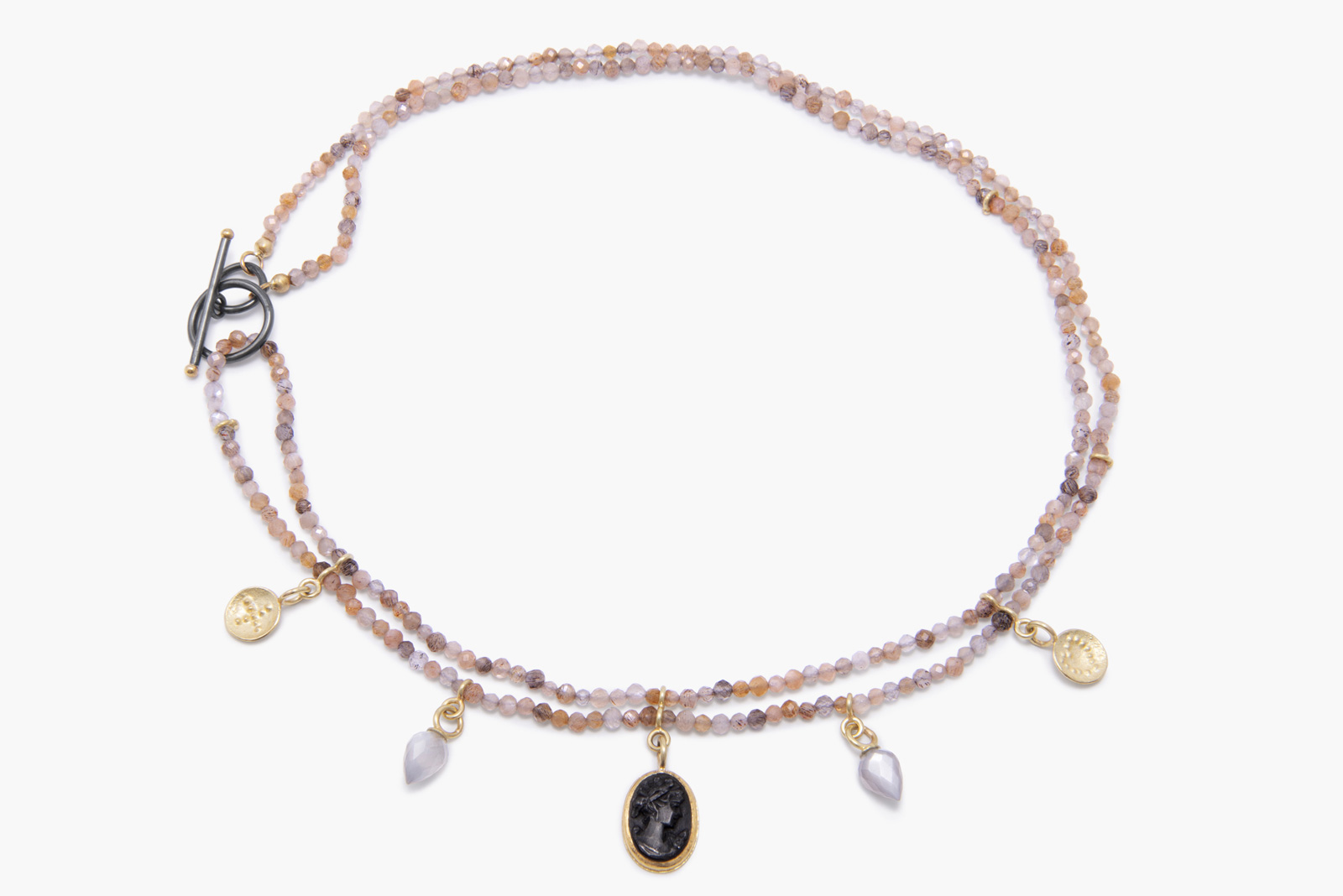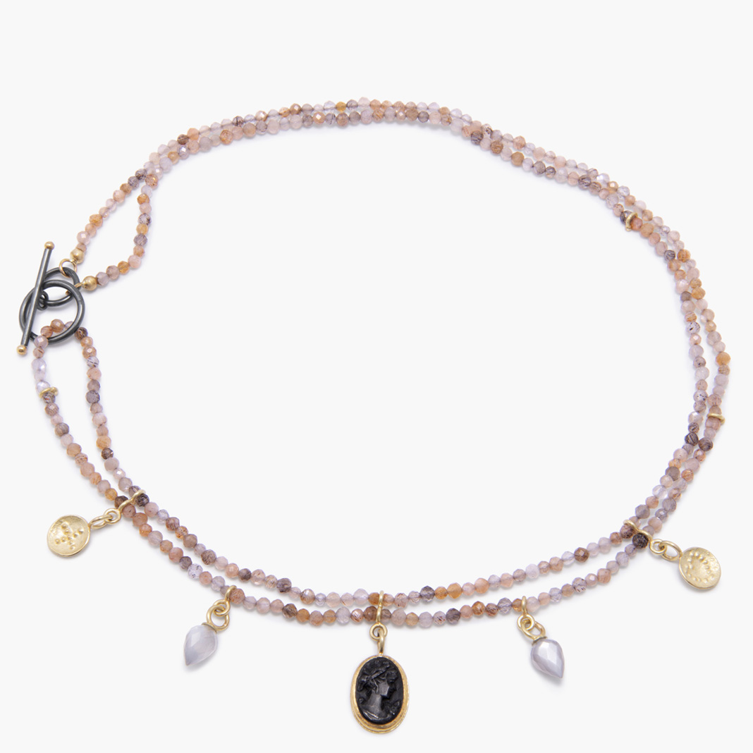 Mondsteinkette, Gold 750, Silber 925 geschwärzt, Mondsteinpampeln, Eisengemme k_ea_12 (Einzelstück, verkauft)