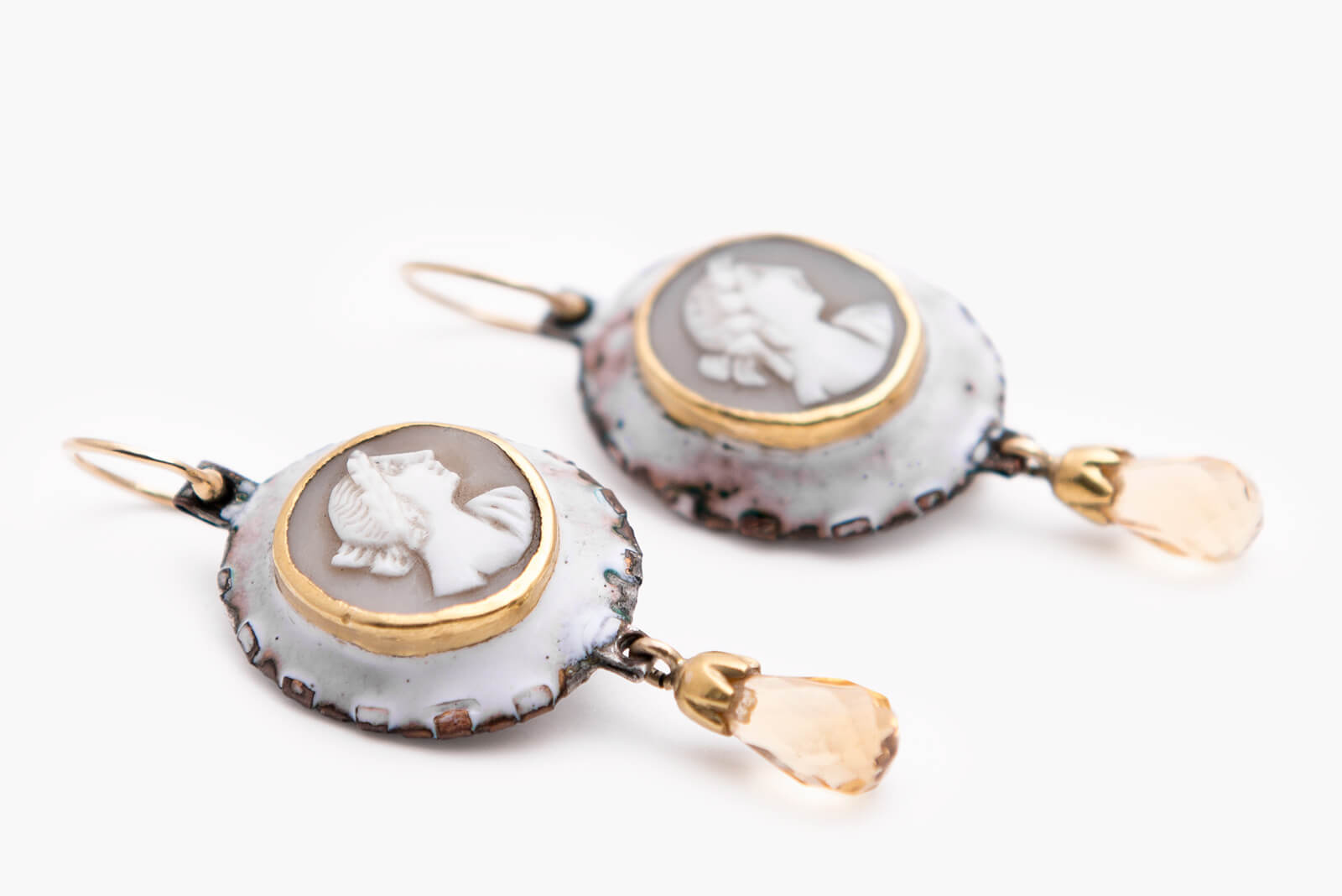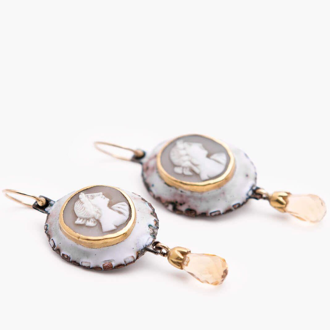 Ohrhänger, Gold 750, 900, Kupfer, Emaille, Muschelgemme, Citrin, aus der Reihe „Gemmenschmuck” o_cd_04