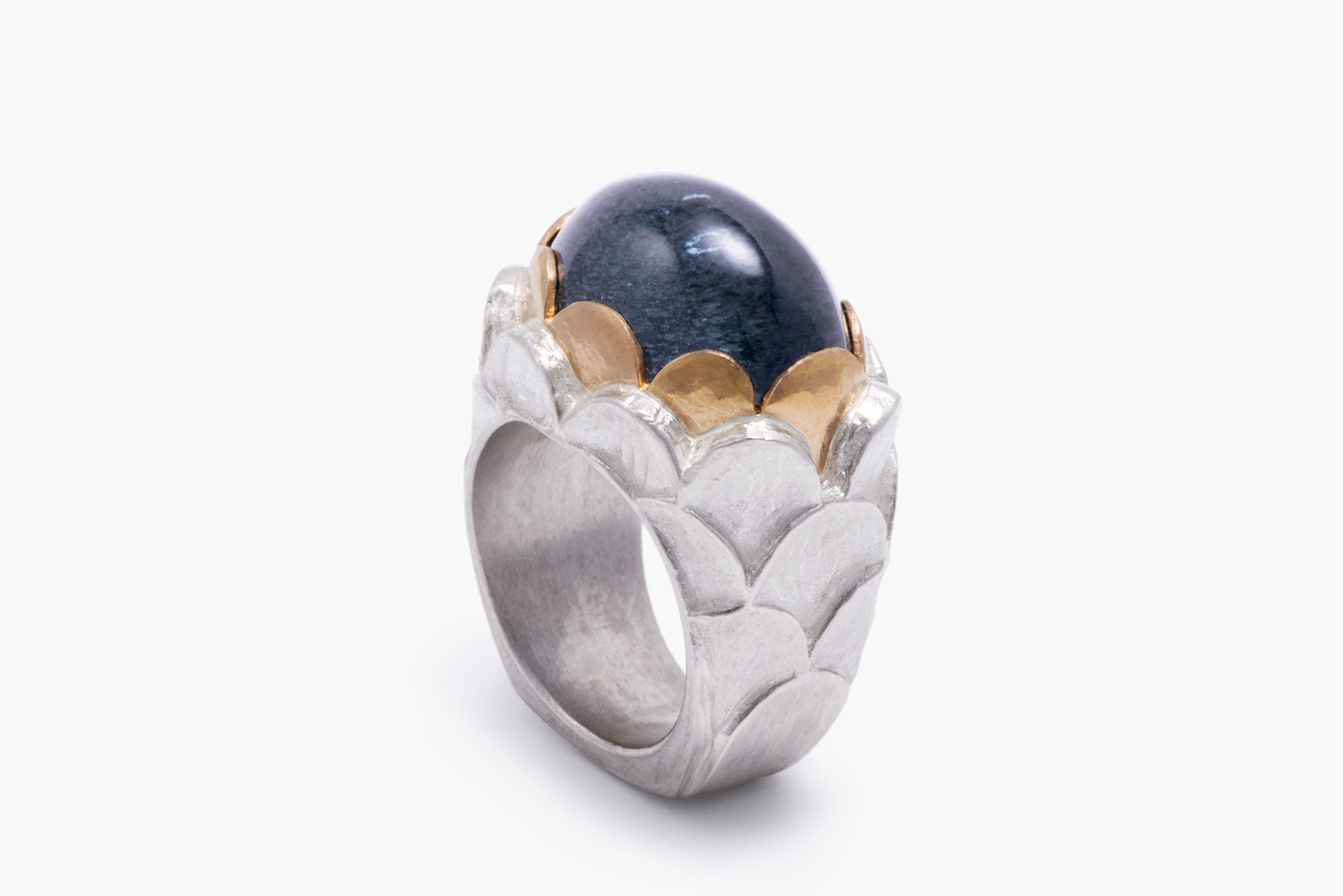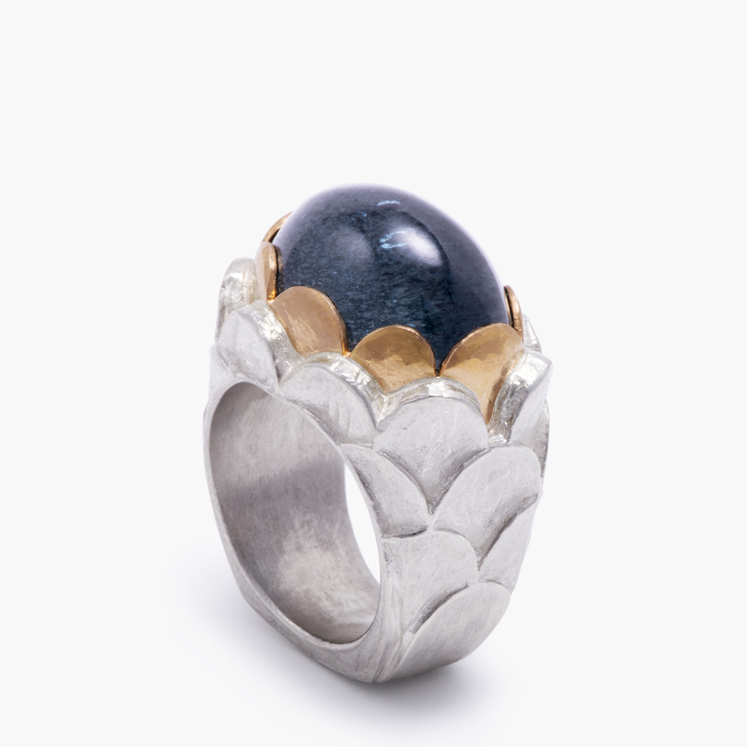 Ring „Schuppe“ Silber 925, Gold 900, Aquamarincabochon
